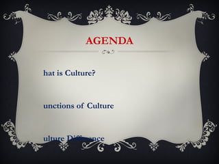 The document discusses gift giving in different cultures. It notes that in some countries like Malaysia and Paraguay, gifts are seen as bribes, while in others like Singapore, government employees cannot accept gifts. The acceptable dollar value for gifts in the US is $25. Gift giving is expected in European, Latin American and Pacific Rim countries but not in places like Africa, Australia, and some European nations. Muslim and Hindu cultures have specific restrictions on appropriate gifts, like not giving alcohol or pork. Jewish gifts should be kosher. The conclusion emphasizes that each society has its own unique culture.