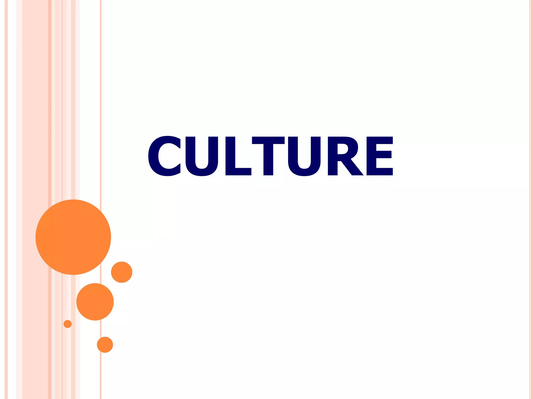 The document discusses the concept of culture, defining it as the cumulative knowledge, experiences, beliefs, values, and behaviors shared by a group of people. It outlines several theories related to culture, including cultural determinism and cultural relativism. It also discusses how culture manifests itself at different levels of depth from superficial symbols to deeper values. Finally, it notes there are multiple layers of culture that can exist for an individual, including national, regional, gender, generational, social class, and corporate levels.