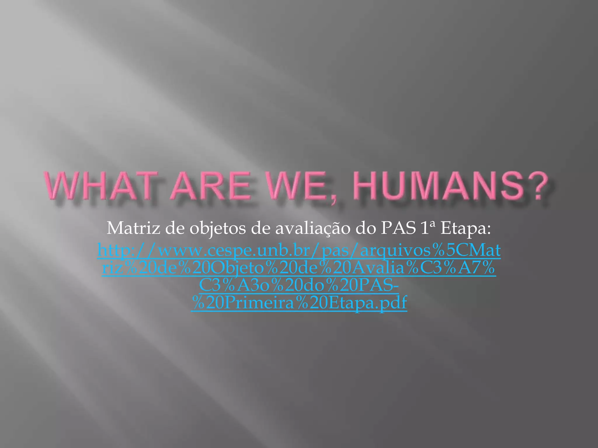 The document discusses a matrix of evaluation objects for the 1st stage of the PAS exam in Brazil. It includes links to the matrix and describes the exam's focus on nature and culture, the body and psychism. Students are asked to distinguish between nature and culture, understand culture as essential to defining humans, and understand how the biological and cultural aspects are deeply associated in humans.