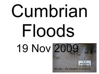 ![Thursday night Burneside north of Kendal under water Road at the side of Derwent Water shut People advised to stay upstairs Emergency centres established – Sheep + Wool, Cockermouth Booths roundabout under water in Keswick Road into Keswick – under water [R Greta]](https://image.slidesharecdn.com/cumbrianfloodsv2-091120062726-phpapp01/85/Cumbrian-Floods-V2-3-320.jpg)