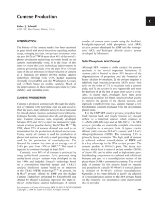This document summarizes the production of cumene, an important intermediate in phenol and acetone production. It discusses the history and various technologies used for cumene production, including solid phosphoric acid, AlCl3, and zeolite catalysts. Currently, over 80% of cumene is produced using zeolite catalyst technologies from companies like UOP, Badger Licensing, and CDTech. The document focuses on UOP's state-of-the-art Q-Max process using beta zeolite catalysts, which offers high cumene yields, regenerable catalysts, and lower production costs compared to older technologies.