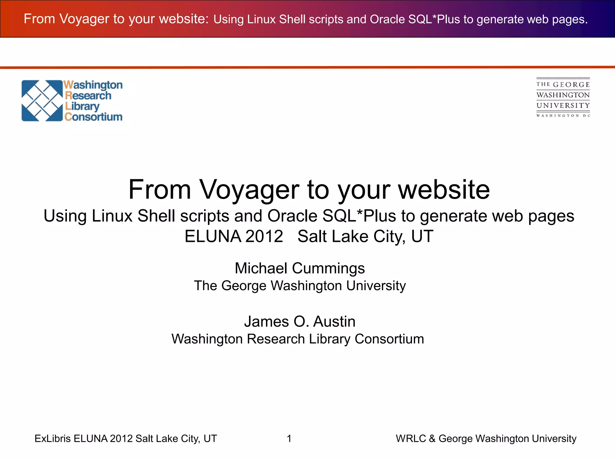 The document outlines the process for generating web pages from Voyager bibliographic data using Linux shell scripts and Oracle SQL*Plus, as presented at the Ex Libris Eluna 2012 conference. It covers installation instructions, including setting up SQL*Plus on Linux and creating a web page for new books using various scripts. Additionally, the document provides a step-by-step walkthrough of the scripting process and examples of the resulting web page structure and content.