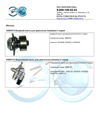 Компания «Энергосистемы» предлагает широкий ассортимент запчастей и комплектующих для генераторов и дизельных двигателей, включая детали для марок Cummins, Caterpillar и других. Все запчасти сертифицированы и соответствуют техническим требованиям, а также доступны по индивидуальному заказу с доставкой по России. Специалисты компании помогают в подборе необходимых деталей и предлагают только оригинальные запчасти.