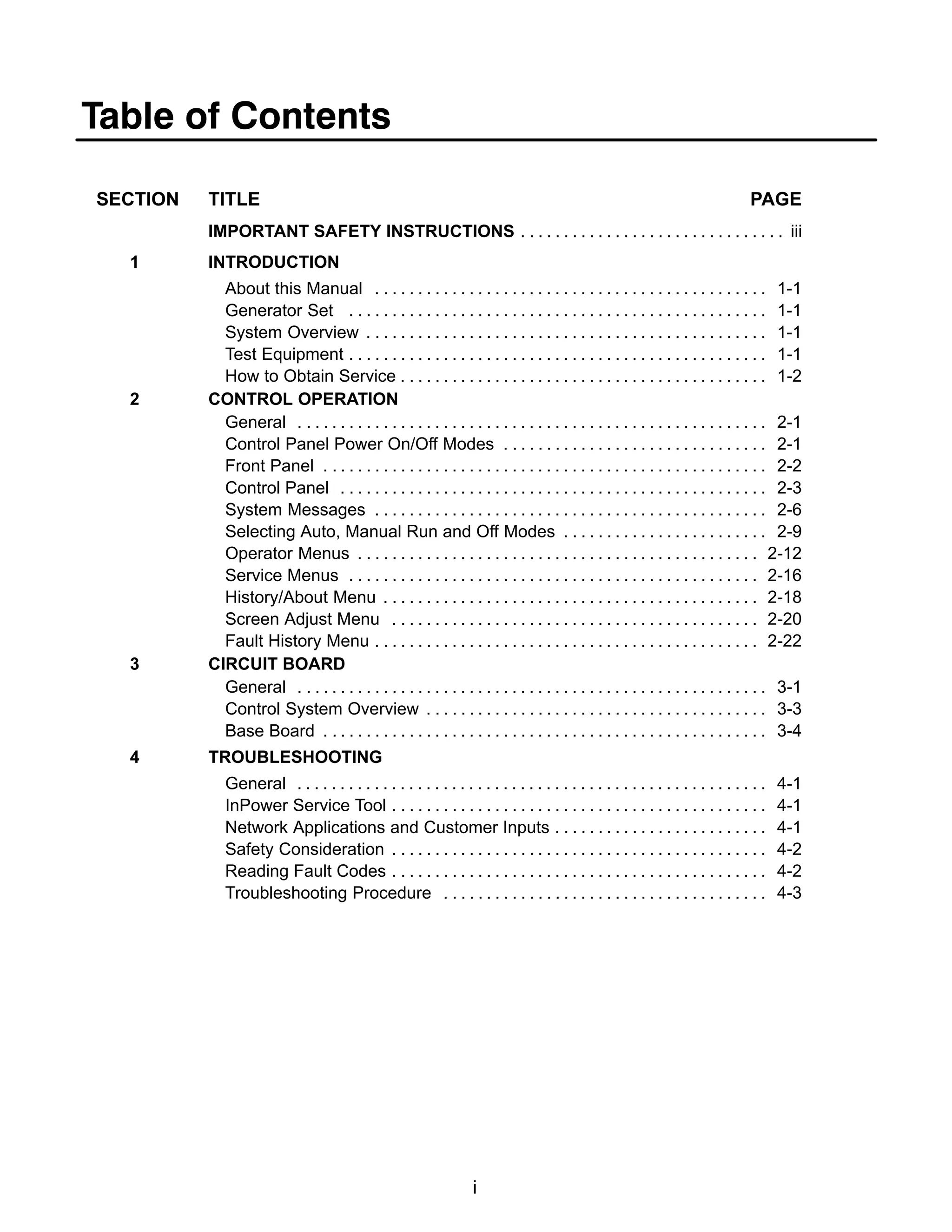 This document is a service manual that provides information for troubleshooting and servicing Cummins generator sets with PowerCommand 1302 controllers. It contains sections on control operation, circuit boards, troubleshooting, control adjustment and service, servicing the generator, wiring diagrams, and menu sequence diagrams. The manual provides technical specifications, diagrams, and procedures for maintenance and repair of covered generator set models.