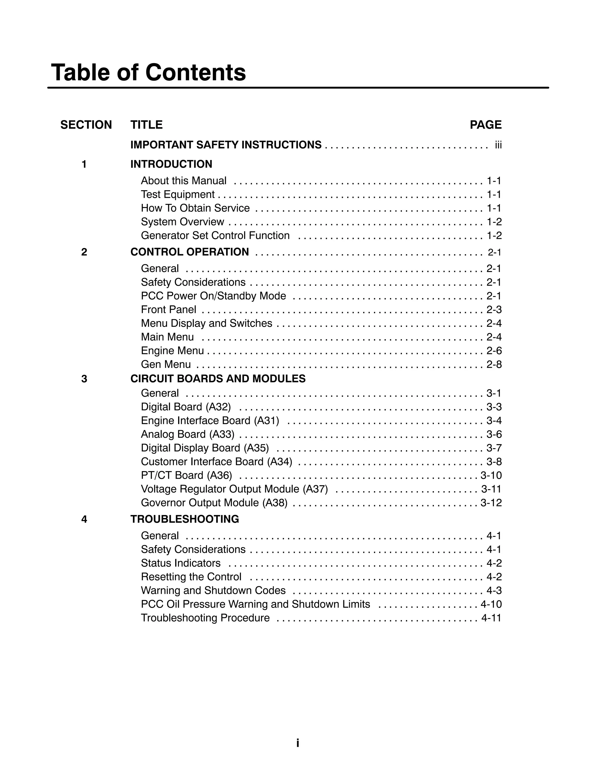 This document is a service manual that provides information for troubleshooting and servicing generator sets and their PowerCommand 3100 controllers. It includes sections that cover control operation, circuit boards and modules, troubleshooting procedures, control service and calibration, servicing the generator, day tank fuel transfer pumps, optional enclosure fuel tank systems, and wiring diagrams. The manual contains important safety instructions and provides detailed technical information, component specifications, and repair and maintenance procedures.