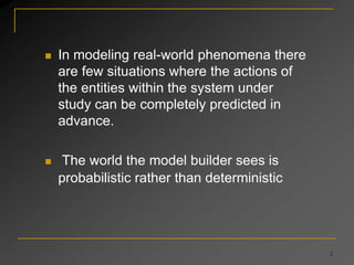 This document defines and explains key probability concepts such as the cumulative distribution function (CDF), expectation, mean, variance, and properties of the CDF. The CDF measures the probability that a random variable X assumes a value less than or equal to x. Expectation, also called the mean or first moment, is the expected value of a random variable X. Variance is a measure of how spread out the possible values of a random variable are around the mean.