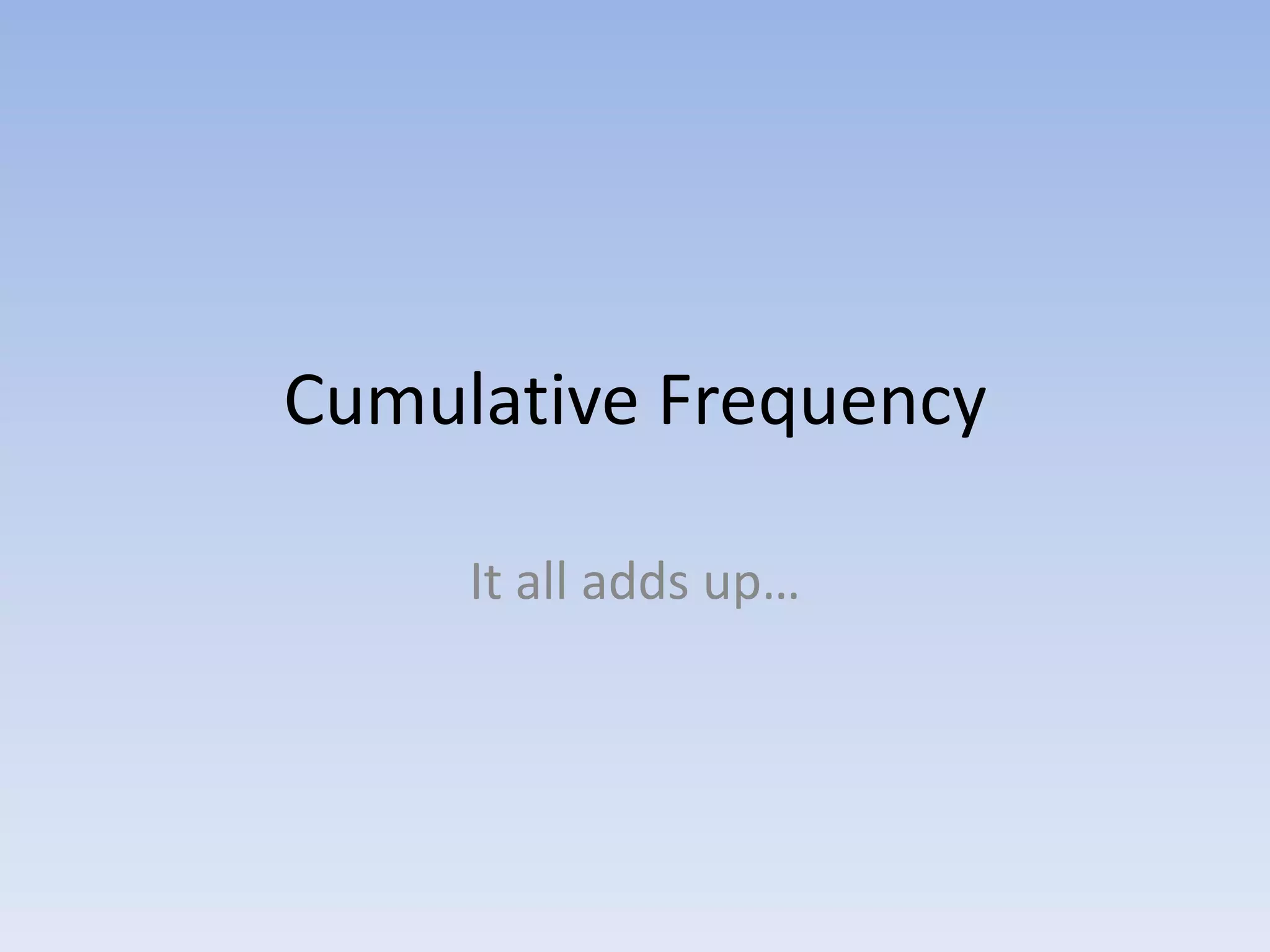 Cumulative frequency is found by adding up all successive frequencies in a frequency distribution table and totals or gradually builds up over time. A cumulative frequency histogram uses the cumulative frequency column from a table to create a graph that looks like upward steps, and an ogive line graph drawn on the histogram connects the corners of each successive column starting from the bottom left corner to show the accumulating total.