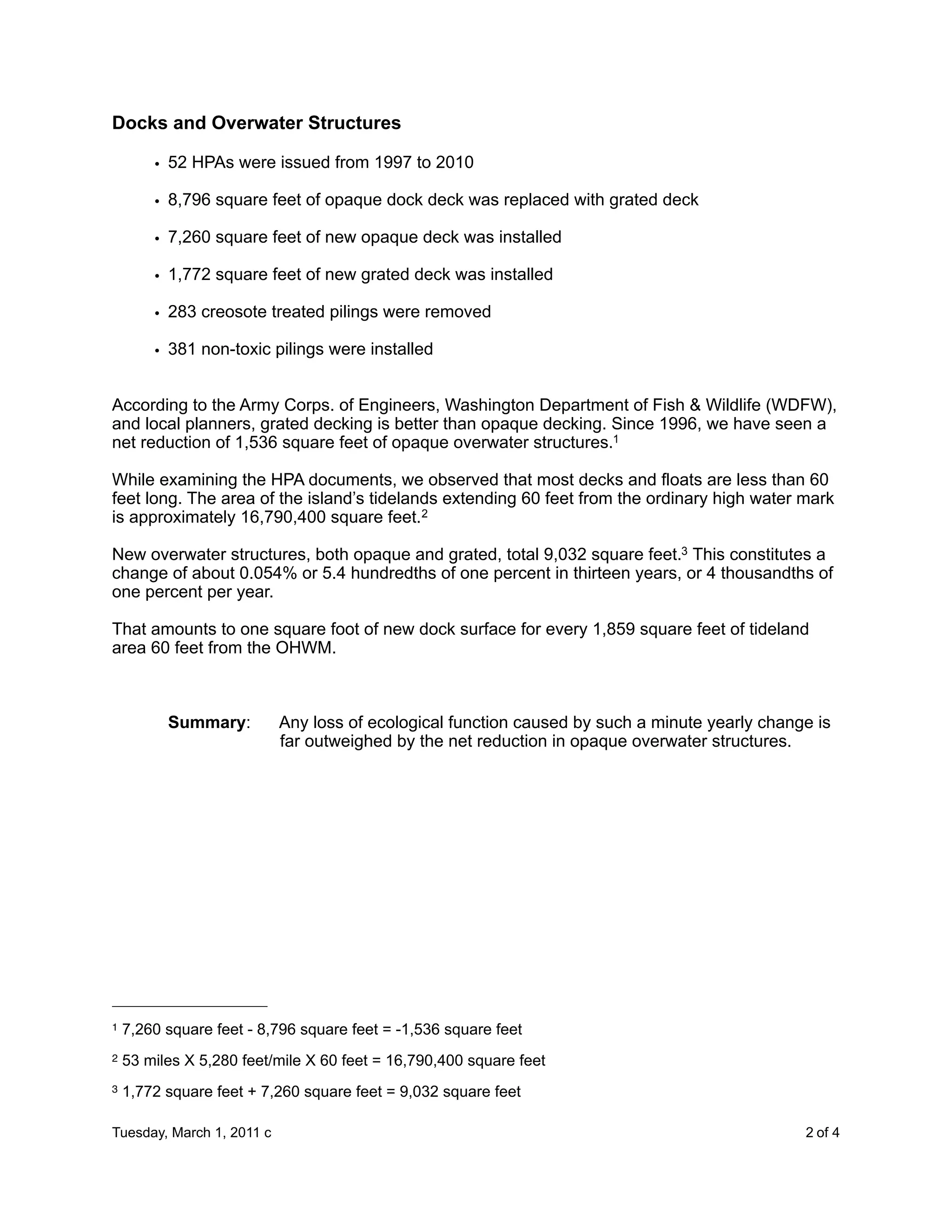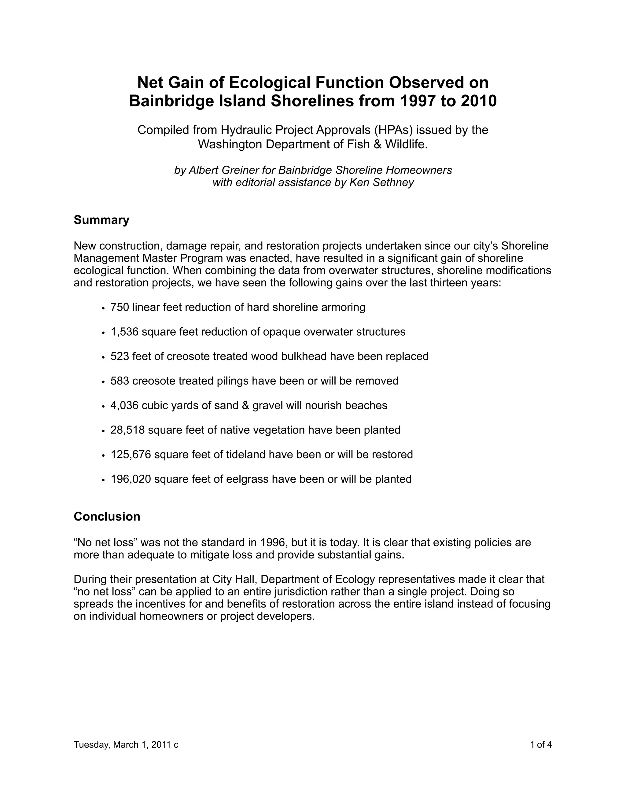 The document analyzes shoreline projects on Bainbridge Island from 1997 to 2010 and finds an overall net gain in ecological function. Specifically, there were reductions in hard shoreline armoring and opaque overwater structures, replacement of creosote-treated wood, and gains from restoration projects including the planting of vegetation and eelgrass. While some new structures were permitted, the minor annual changes are outweighed by the ecological improvements from other projects.