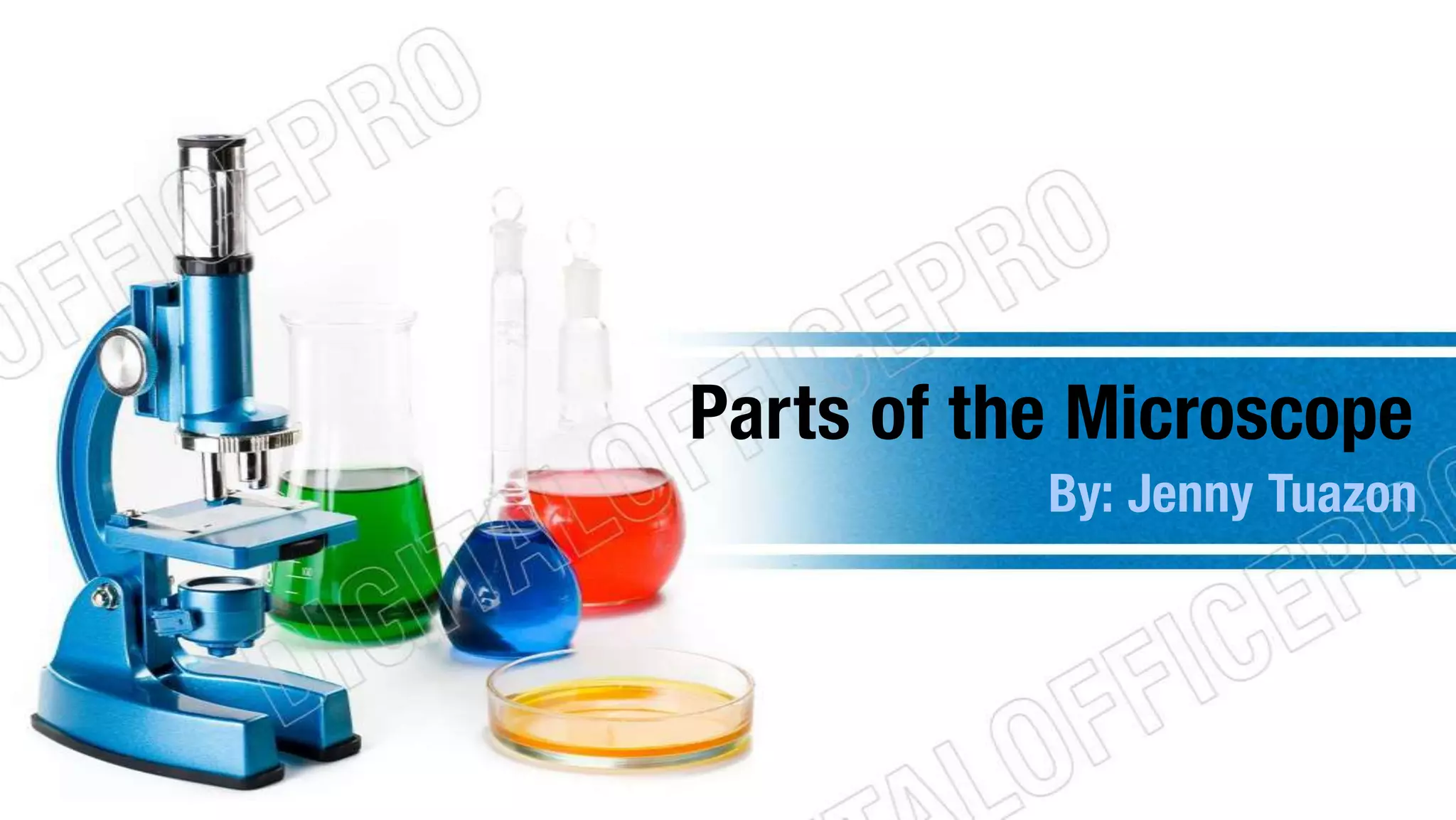 The document outlines the main parts of a microscope, including the eyepiece for viewing specimens, the revolving nosepiece for attaching different objectives or lenses, and the stage for holding specimens in place under the objectives. It also describes other key parts like the body tube connecting the eyepiece and nosepiece, coarse and fine adjustments for focusing, a condenser for illuminating specimens, and a mirror and diaphragm for controlling light. In total, the document identifies 14 main parts that make up a standard microscope.