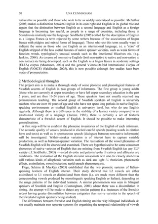 This document summarizes an initial study analyzing the phonetic features of English spoken by young native Swedish speakers. The study aims to document an emerging variety of "Swedish English" without native speaker norms. Preliminary acoustic analysis of one participant's vowels found her English high front vowels were qualitatively dissimilar from her Swedish vowels. Her English /u:/ was also fronted in some words, possibly influenced by Estuary English. Further study of consonants, timing, and comprehensibility is planned.