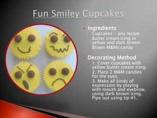 This document provides recipes and instructions for decorating cupcakes to look like smiley faces, snowflakes, wild lions, and sailboats. For the smiley face cupcakes, yellow icing is used for the base and brown icing is used to pipe eyes, mouth, and eyebrows. For the snowflake cupcakes, half are iced red and half green with white icing piped in a snowflake pattern. The lion cupcakes use marzipan for the face and various icing colors to pipe hair, eyes, mouth and nose. The sailboat cupcakes are iced white with red, blue, yellow and brown icing used to pipe sailboats, water
