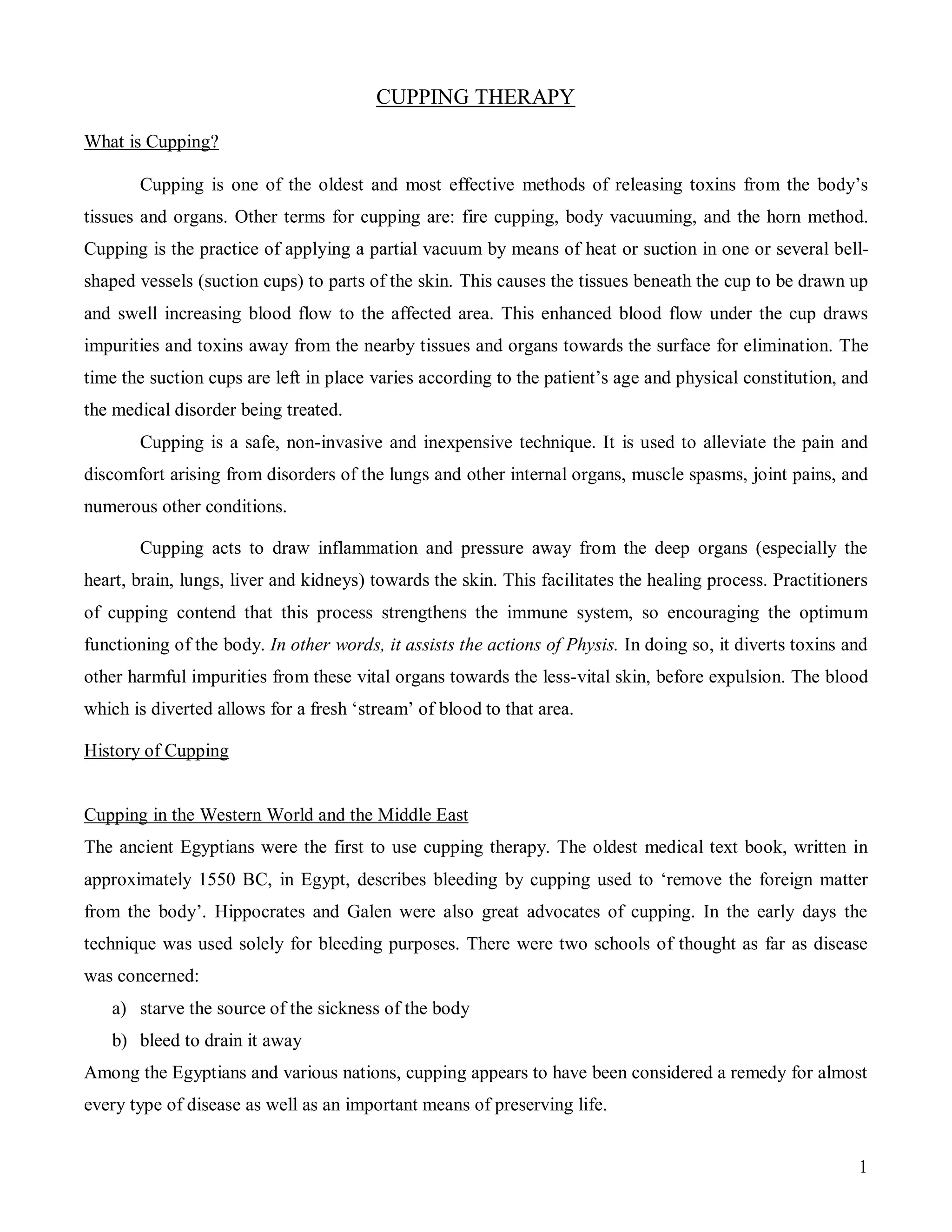 Cupping therapy is an ancient healing method that involves placing cups on the skin to enhance blood flow. It works by using suction to draw the skin and deeper tissues up underneath the cups. This increases circulation and brings impurities to the surface of the skin to be released. Cupping has been used for thousands of years in places like Egypt, China, and the Middle East to treat various health conditions by reducing inflammation and toxins in the body. It stimulates blood and lymph flow while strengthening the immune system. Cupping can help many issues like pain, respiratory problems, and skin conditions. It is a generally safe technique when performed properly by a trained practitioner.