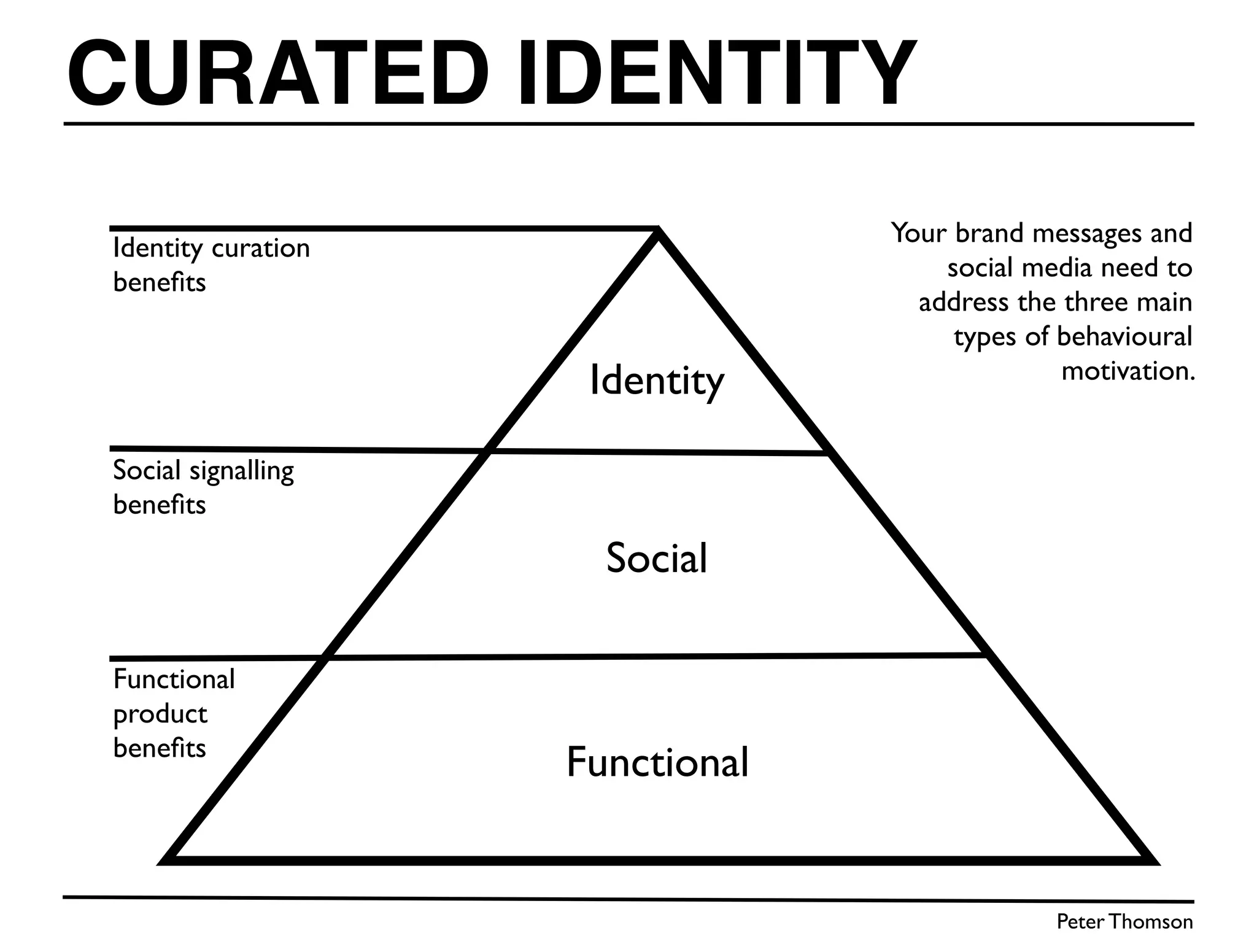 The document discusses the importance of curating brand messages and identity for social media. It identifies three main types of behavioral identity motivation: social signaling benefits, social functional benefits, and product functional benefits. Peter Thomson is mentioned in relation to these concepts.