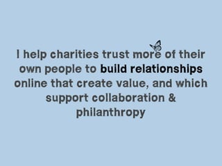 This document discusses strategies for charities and non-profits to effectively leverage social media and online engagement. It advocates moving from an approach of just adding social media platforms to having a clear social media strategy focused on long-term engagement and relationship building. It also emphasizes the importance of staff sharing their experiences in real-time to fuel action and connecting with supporters through shared narratives and stories.