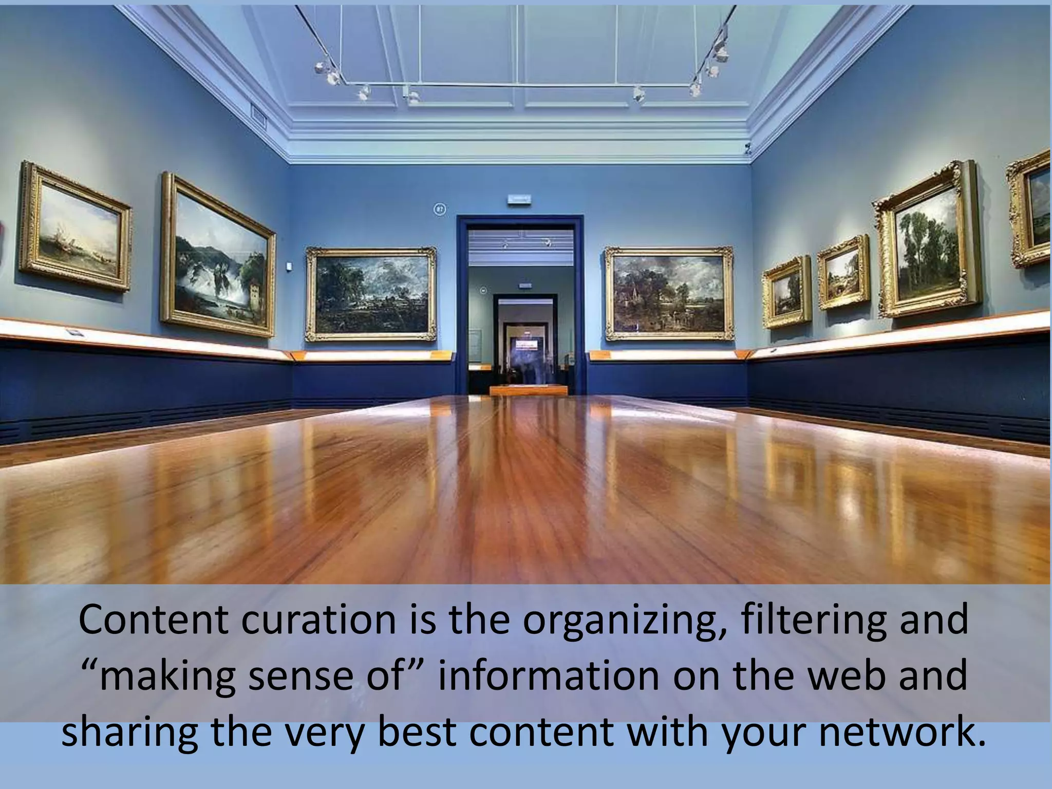 Content curation involves seeking out, making sense of, and sharing high-quality information on the web. It provides context and meaning to content for others. Content curators seek to stay informed in their field, make sense of information by creating curated lists or applying lessons learned, and exchange resources and insights with their network through sharing. An ideal content curation practice involves defining topics and sources, scanning more than capturing, only sharing content that adds great value, and integrating curation into one's daily work flow.