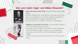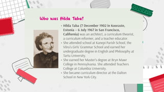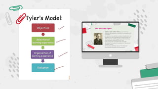 The document discusses several models of the curriculum development process, including those proposed by Ralph Tyler, Hilda Taba, and Galen Saylor and William Alexander. All the models utilize the key processes of curriculum planning, designing, implementing, and evaluating. Tyler's model and the Saylor/Alexander model are deductive, starting broadly and becoming more specific, while Taba's is inductive, starting with specifics. The models provide a linear order and sequence for progressing through the different steps of curriculum development and combine both a development scheme and instructional design.