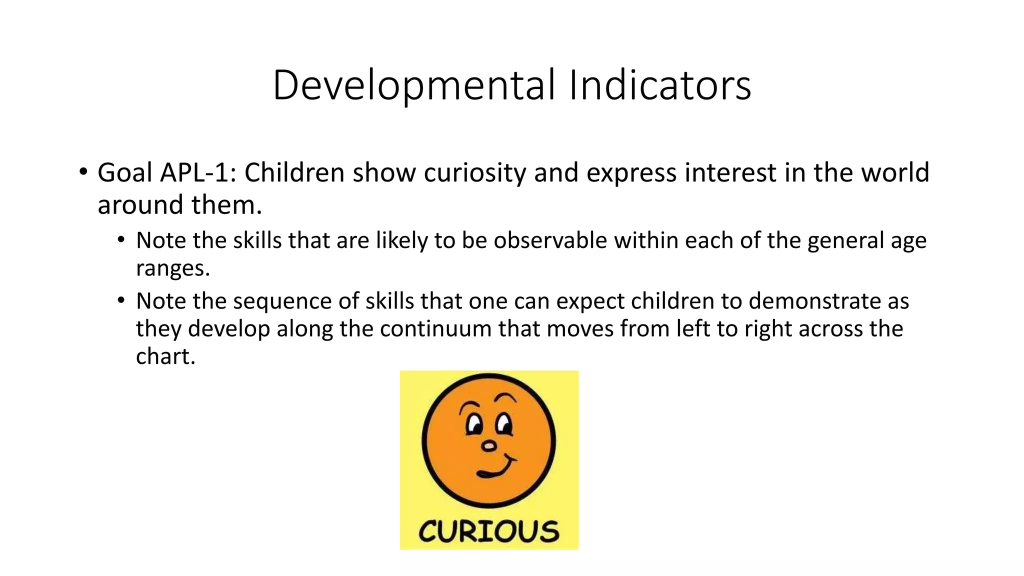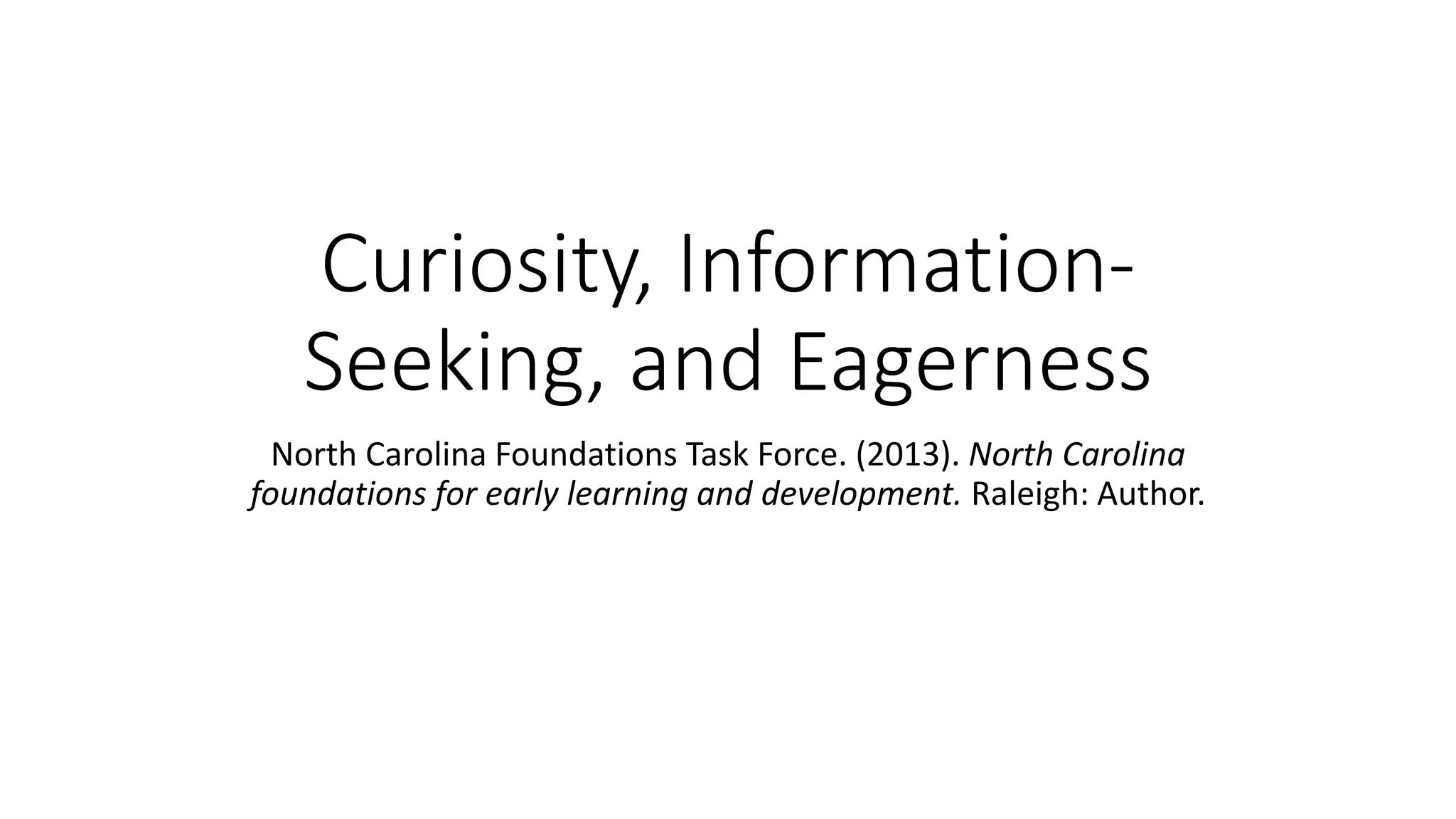 The document outlines developmental indicators focused on fostering curiosity and information-seeking in children from infancy through preschool age within North Carolina's educational framework. It provides specific strategies to support this development, including creating engaging environments, promoting safe exploration, and facilitating meaningful interactions. Suggestions are tailored for different age groups, emphasizing the importance of responsive communication and adapted materials to meet individual needs.