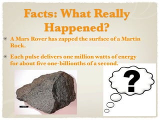 A Mars rover used a laser to zap the surface of a rock on Mars. Each laser pulse delivered one million watts of energy for five billionths of a second. The laser system, called ChemCam, is designed to take 14,000 measurements throughout the Curiosity rover's mission on Mars. The rover mission generated different opinions, with some viewing it as an achievement and others seeing it as mysterious.