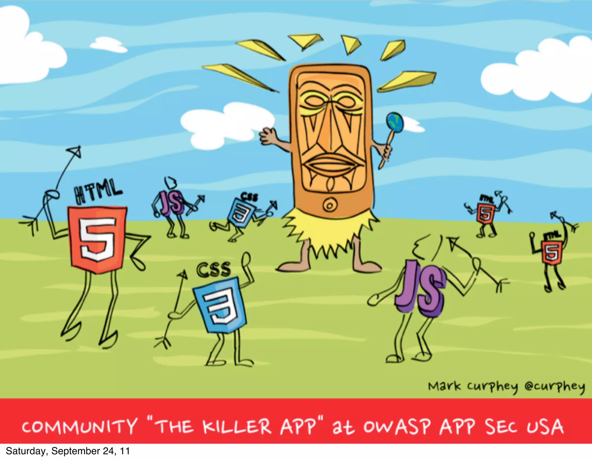 This document appears to be notes from a presentation given by Mark Curphey on September 24, 2011 about the future of OWASP (Open Web Application Security Project) and security. It contains ideas for how OWASP can improve by 2021, including developing a more structured organization with defined leadership roles, offering resources like housing for volunteers, and creating security tools specifically for developers. The presentation also discusses challenges like different perspectives between security, development and operations teams and ideas for bridging those gaps.