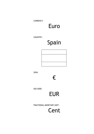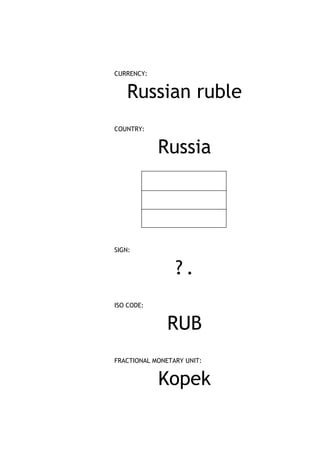 This document provides information on several world currencies, including the Russian ruble used in Russia, the euro used in Spain, the British pound used in the United Kingdom, the US dollar used in the United States, the Venezuelan bolivar used in Venezuela, the Peruvian nuevo sol used in Peru, and the Canadian dollar used in Canada. For each currency, it lists the country, currency sign, ISO code, and fractional monetary unit (e.g. cents, kopeks).