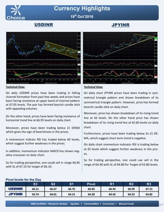 On October 19, 2016, the Indian rupee appreciated by 15 paise to close at 66.73 against the US dollar due to dollar selling and positive market sentiment. Key economic indicators showed the US CPI increased by 0.3% and China's GDP remained steady at 6.7%, while UK CPI rose to 1%. Technical analysis suggests a bearish trend for JPYINR and EURINR, while GBPINR is showing potential for a bullish movement.