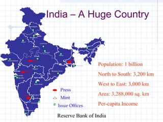 The document summarizes the distribution of currency notes and coins across India by the Reserve Bank of India. It notes that India has a large population spread across a vast geographic area. The RBI distributes currency to banks through a network of issue offices and currency chests. Notes and coins are produced by mints and printing presses then transported through RBI offices, chest branches, and commercial banks to the public. The RBI faces challenges in efficiently managing the large volume and wide distribution of currency throughout India.