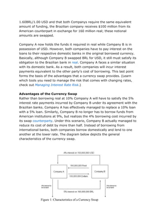 1) Currency swaps involve two companies exchanging loans in different currencies so they can each borrow at lower domestic rates rather than higher international rates. For example, a US and Brazilian company arrange for the US company to borrow Brazilian reals from a Brazilian bank at 5% while the Brazilian company borrows dollars from a US bank at 4%.