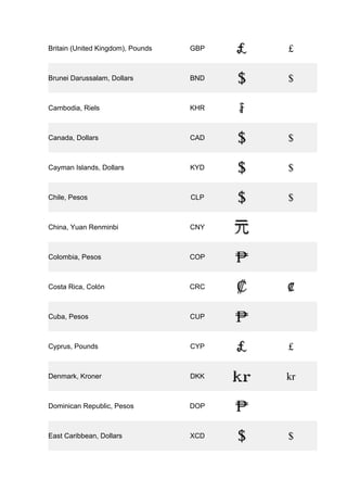 This document lists currency symbols and codes for many countries around the world. It provides the currency name, code, graphic symbol, and code2000 for each country. Some entries also include notes on obsolete currencies. In total, over 70 currencies are represented from countries spanning several continents.