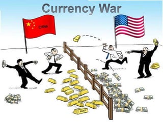 Currency wars occur when countries deliberately devalue their currencies to gain a competitive advantage in international trade and boost exports. There have been several periods of currency wars throughout history. Most notably in the 1930s during the Great Depression when countries abandoned the gold standard and pursued policies of competitive devaluation, dubbed "beggar thy neighbor". More recently, after the 2008 financial crisis, export-focused countries like China devalued their currencies, which led other nations like the US and UK to also devalue their currencies to remain competitive in export markets. Currently, the European Central Bank has launched a large quantitative easing program while China and other Asian countries have also devalued currencies, risking another wave of global currency wars.