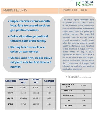 From August 11 to 14, 2014, the Indian rupee experienced fluctuations due to geopolitical tensions, recovering slightly from five-month lows but marking its worst weekly performance since August of the previous year. Key economic indicators and currency rates were reported, with the rupee closing at 61.41 against the US dollar. Market sentiment remained weak, affecting expectations for foreign fund inflows into local assets.