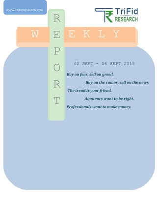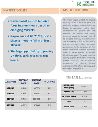 The weekly report provides an overview of currency exchange rates and the Indian rupee from September 2nd to September 6th, 2013. The rupee posted its largest monthly decline in at least 18 years but rebounded on aggressive central bank intervention. The report analyzes currency exchange rates, gives support and resistance levels for various currency pairs, and outlines upcoming economic indicators and international news that may impact currencies.