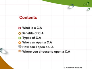 This document provides information about current accounts, including what they are, their benefits, eligibility requirements, and types of accounts. A current account allows customers to make deposits and withdrawals without notice and is used for frequent transactions. Benefits include receiving payments, withdrawing cash, setting up direct debits and standing orders. Customers must be 18 years or older and provide identification documents to open an account. There are several types of current accounts including basic, overdraft, student/young person, graduate, foreign currency, and accounts with special offers. The document also describes how to open an account and the bank's expansion over the years to 580 branches internationally by 2013.