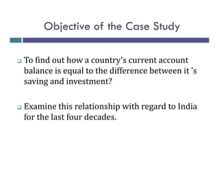 This document discusses India's current account balance from 1972 to 2012. It begins by defining current account balance as the difference between a country's savings and investment. It then examines India's current account balance, gross domestic savings, and gross domestic capital formation over this period. The analysis finds that India's current account balance has mostly been negative as national savings were generally less than national investment. While the current account deficit decreased briefly when savings increased, overall savings have declined since 2007-2008, contributing to a widening current account deficit and stress on India's balance of payments.