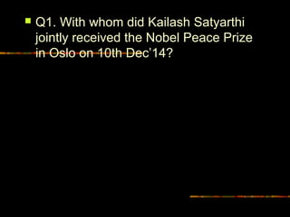 - Kailash Satyarthi won the Nobel Peace Prize jointly with Malala Yousafzai for their work on children's rights.