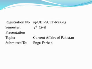 The document summarizes current affairs in Pakistan, including a joint military exercise between Pakistan and Russia taking place from October 10th. It discusses the 2016 Uri attack in India-administered Kashmir and notes that Pakistan has not been implicated. It also outlines China's plans to develop the Gwadar Port area through a new deal and job opportunities with the Gwadar Port Authority, as well as Chinese President Xi Jinping's plans to inaugurate Gwadar projects. Finally, it states that the Pakistani Armed Forces are prepared for potential conflict with India, and Bugti tribesmen in Balochistan are also prepared to fight in Kashmir.