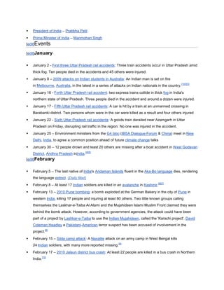 This document provides a summary of major events that occurred in India throughout 2010. It describes several train and bus accidents in January and February caused by fog and poor weather that resulted in multiple deaths. It also mentions terrorist bombings in Pune and Dantewada in February and May that killed dozens of people. Natural disasters such as cyclones, earthquakes, and heat waves affected parts of India throughout the year.