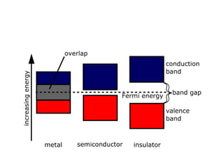 This document discusses electric current and metallic conductors. It defines current as the rate of flow of electric charge and gives its unit as the ampere. Current density is defined as current per unit cross-sectional area and follows the continuity equation. Metallic conductors allow the flow of electrons known as free or conduction electrons under the influence of an electric field due to their electronic band structure. Mobility and conductivity relate the drift velocity and current density of electrons in a conductor to the applied electric field.