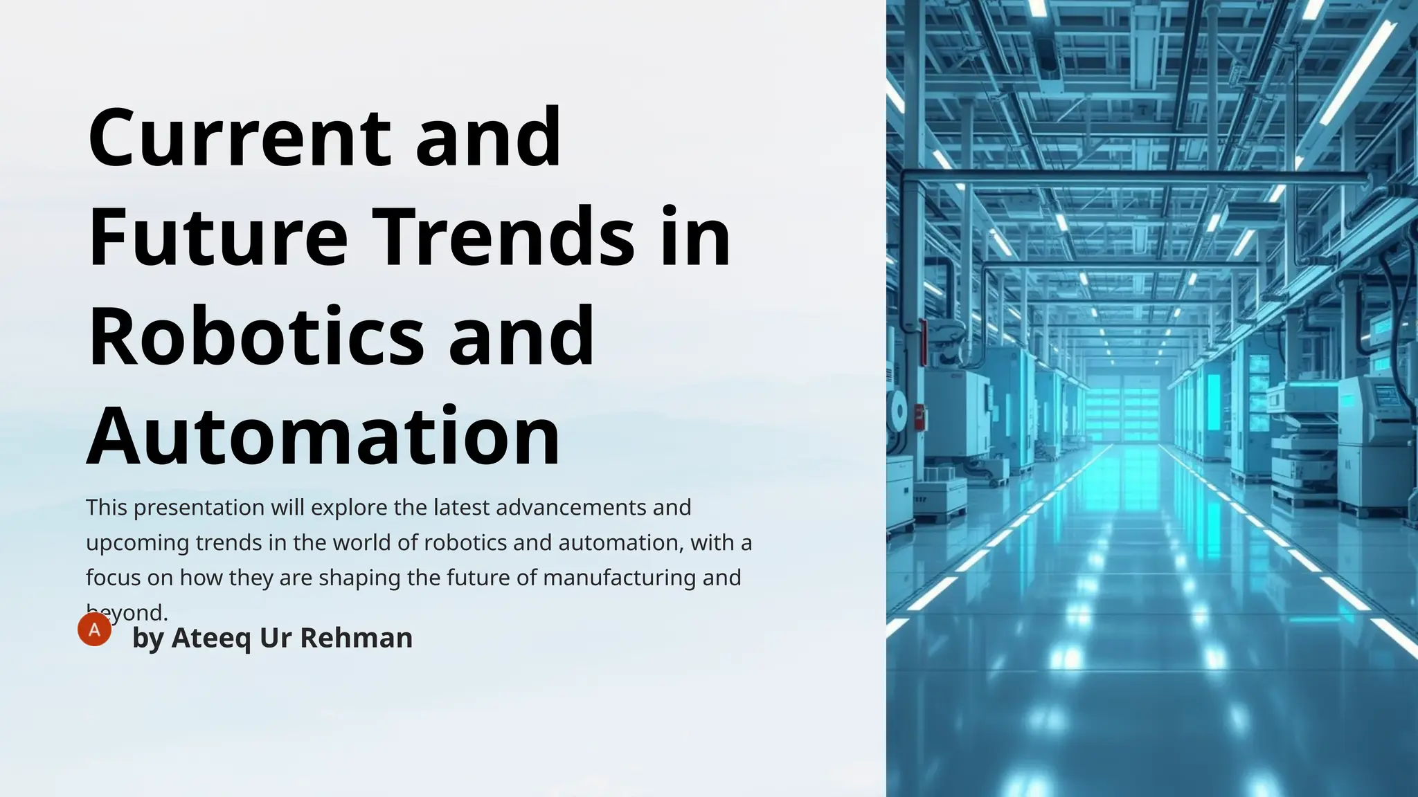 This presentation discusses current and future trends in robotics and automation, focusing on advancements shaping manufacturing and related fields. Key topics include Industry 4.0 technologies, collaborative robots, AI-driven processes, and the emergence of Industry 5.0, which emphasizes human-robot collaboration and sustainable manufacturing practices. The future of robotics is portrayed as a landscape of advanced autonomy and enhanced human capabilities in various industries.