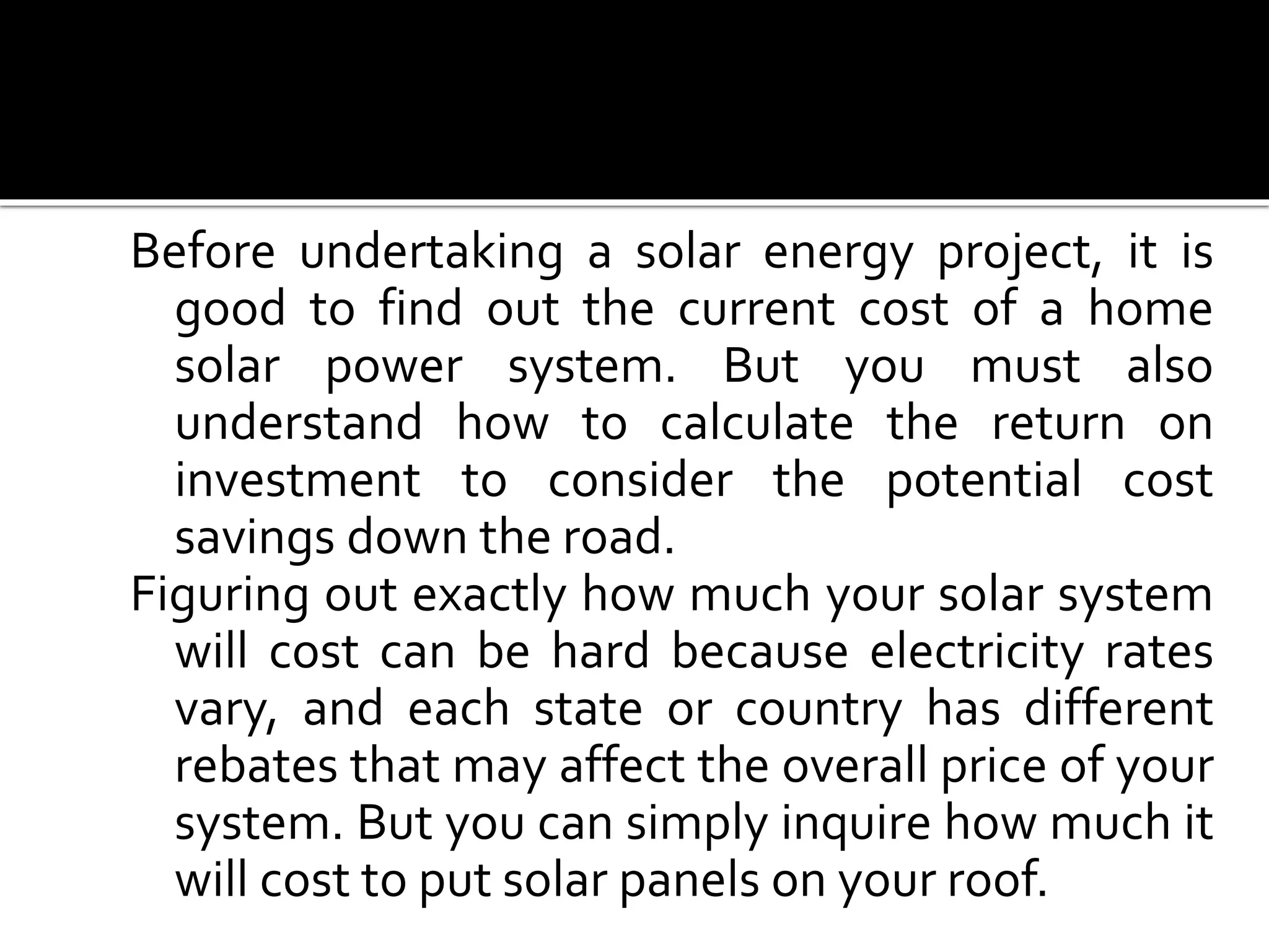 Before starting a solar energy project, it's crucial to understand the costs of a home solar power system and calculate the return on investment, as prices and incentives vary by location. Current solar panel costs have significantly decreased over the years, and the total cost will depend on factors like the size of the system, wattage requirements, and additional equipment like batteries and inverters. Consulting with a certified solar panel installer can provide accurate estimates and professional guidance on the best options for your home.