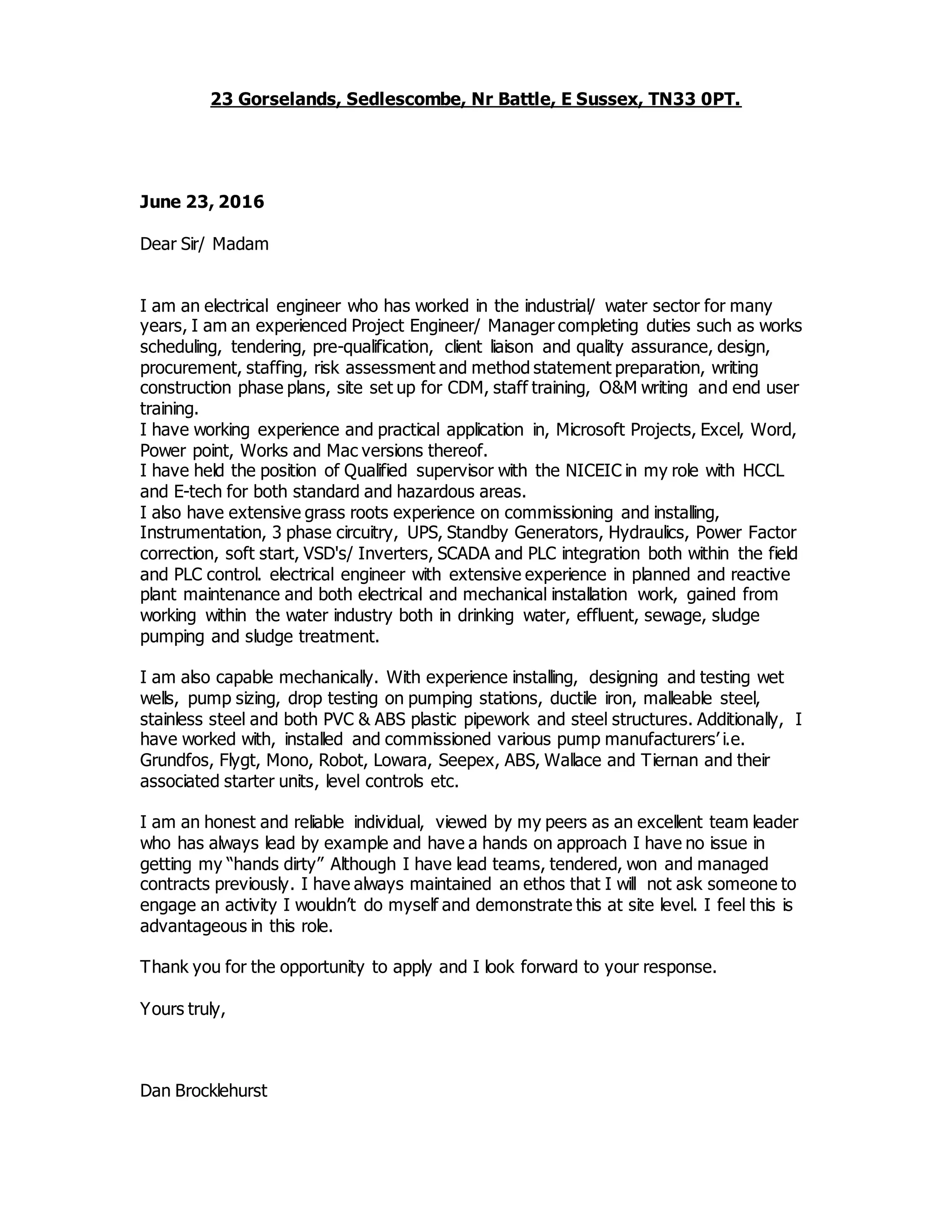 The document is a cover letter and resume submitted by Dan Brocklehurst for a job application. It summarizes his experience as an electrical engineer working in industrial and water sectors for many years, with responsibilities including project management, design, procurement, and quality assurance. It details his extensive experience in areas like instrumentation, circuitry, generators, hydraulics, and pump installation for various companies in water and wastewater industries. It also emphasizes his leadership skills and hands-on work ethic.
