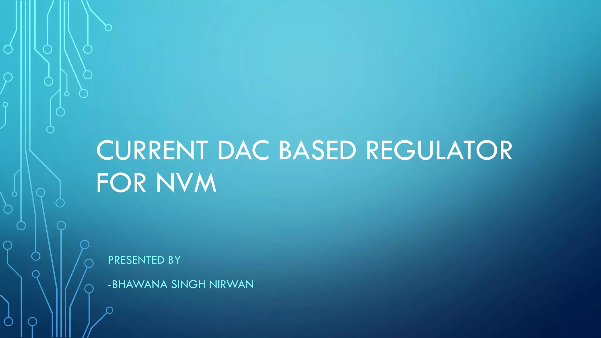 The document presents a proposed current-based voltage regulator for non-volatile memory (NVM) such as phase change memory. It discusses concerns with scaling flash memory technology, alternatives like PCM and their operation. It then describes a voltage regulation scheme with different supply voltages for write drivers, column decoders and row decoders. The proposed current-based regulator design includes a three-stage error amplifier and current DAC for modulation. Biasing circuits are also presented. References are provided at the end related to PCM, voltage regulators, op-amp design techniques and voltage references.
