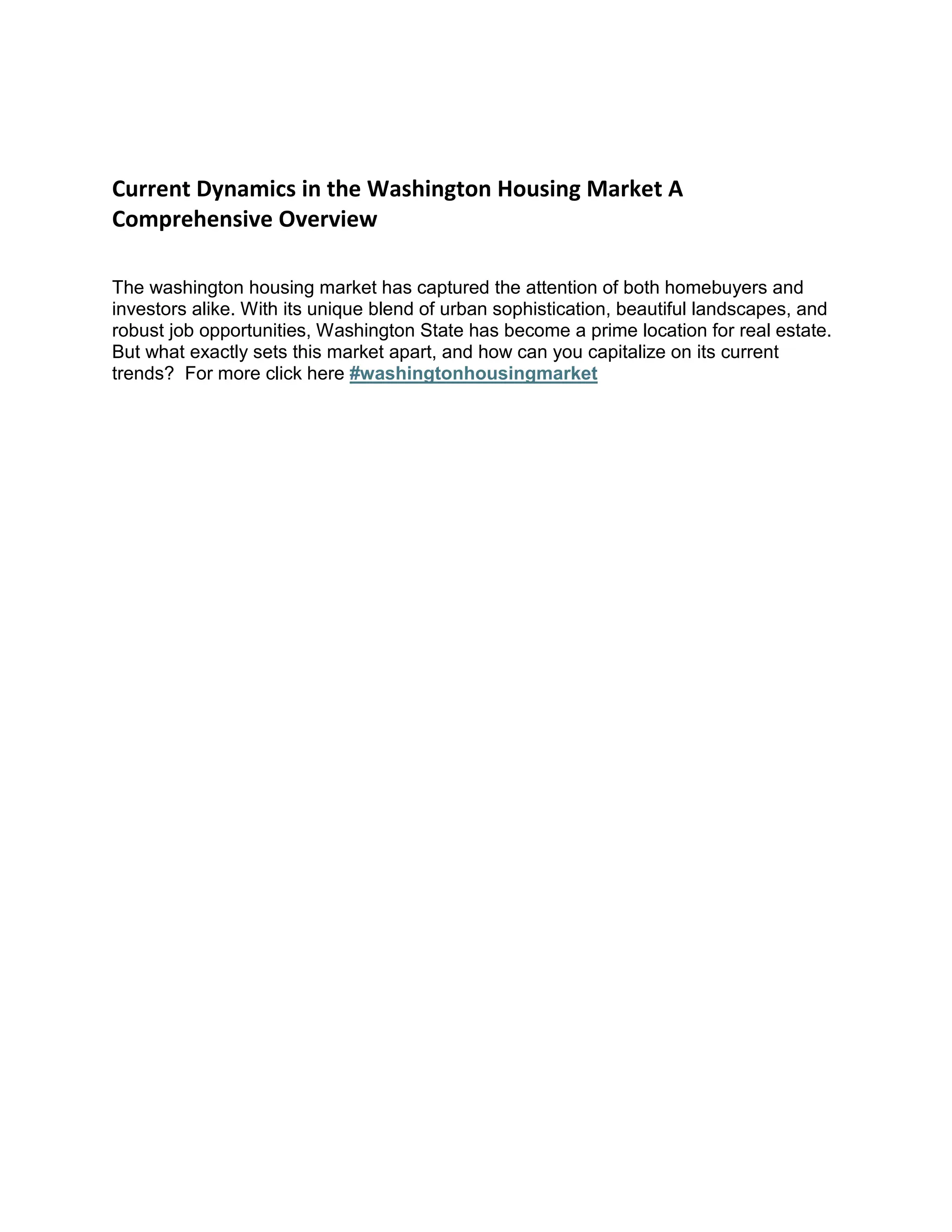 The Washington housing market is drawing interest from homebuyers and investors due to its urban sophistication, scenic beauty, and strong job market. This document provides an overview of the unique aspects of the market and offers insights on capitalizing on current trends.