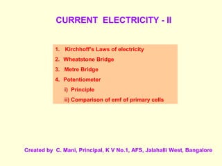 1. This document discusses several topics related to electricity including Kirchhoff's laws, Wheatstone bridge, metre bridge, and potentiometer.