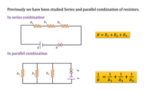 The document discusses various principles and laws related to current electricity, focusing on Kirchhoff's laws for analyzing complex circuits and the Wheatstone bridge for measuring resistances. It explains the applications of potentiometers and galvanometers in circuitry, including how to convert a galvanometer into an ammeter or voltmeter, emphasizing the importance of these devices in electrical measurements. Additionally, it addresses potential sources of errors and the advantages of potentiometers over traditional voltmeters.