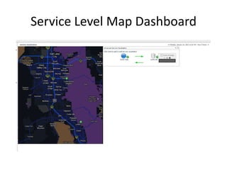 The document describes several existing Foglight dashboards including a service level map dashboard, infrastructure overview, individual device drill down, colo overview, rack dashboard, and phone dashboard widget. It also mentions a service-level dashboard, specific device dashboard, and root cause analyzer with drill down functionality.