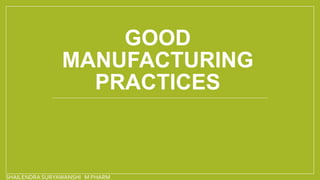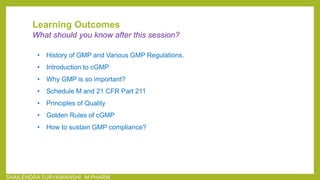 The document covers the history and importance of Good Manufacturing Practices (GMP), detailing regulations from 1937 to the present that ensure drug safety, quality, and efficacy. It emphasizes the need for adherence to Current Good Manufacturing Practices (cGMP) to prevent contamination and ensure compliance with safety standards across various pharmaceutical processes. It outlines critical components of GMP, including quality management systems, personnel training, facility requirements, and regulatory compliance as mandated by agencies such as the FDA.