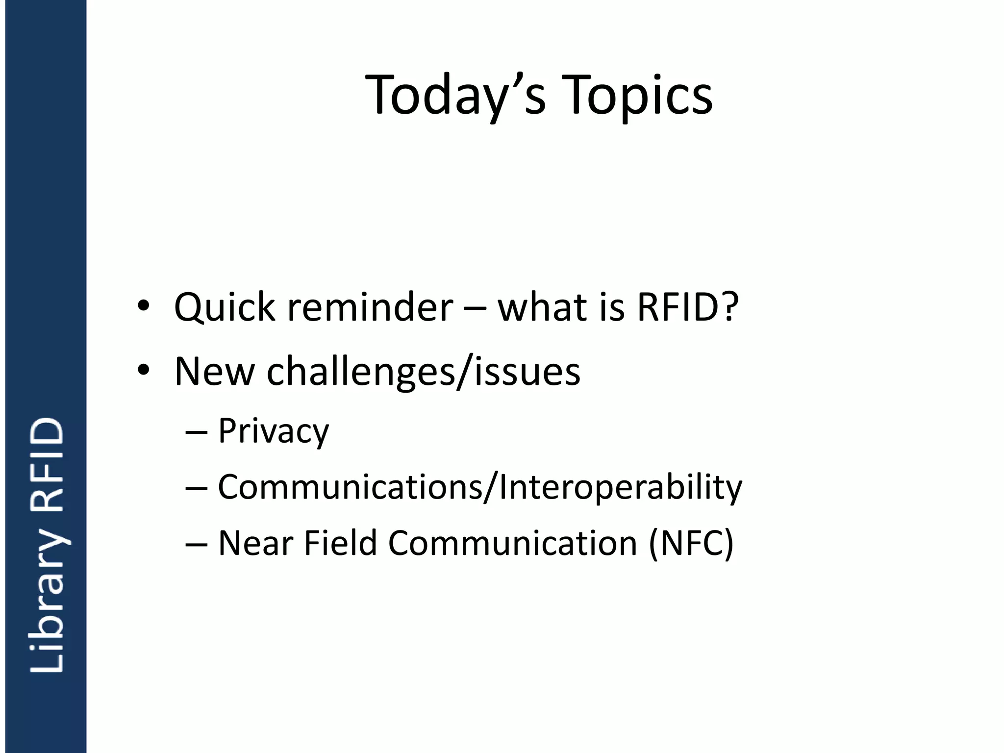 This document discusses current issues with RFID technology in libraries. It covers privacy concerns around RFID and new EU standards addressing these issues. It also addresses limitations of current RFID communication protocols between library systems and RFID tags. Newer technologies like Near Field Communication and mobile apps provide opportunities but also challenges around ensuring interoperability. The document recommends libraries rethink purchasing strategies and engagement with standards bodies to help RFID reach its full potential.