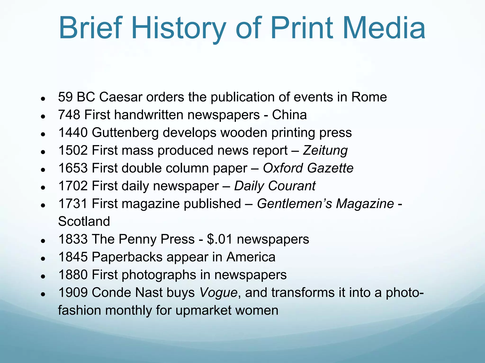 This document summarizes the state of print media including newspapers, magazines, and out-of-home advertising. It traces the history of print media from ancient Rome to modern digital formats. It finds that while print still reaches many consumers, advertising revenue has declined significantly in recent years for newspapers and magazines due to competition from other media like the internet and mobile devices. The document also outlines trends in the print industry toward digital editions, paid content models, improved design and more data-driven advertising.