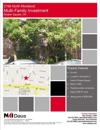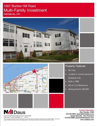 This document provides information on two industrial properties for sublease or sale in Ohio. The first property is located in Avon, OH and offers up to 182,400 square feet of space including 6,000 square feet of offices. It has 36 foot clear height, 56x50 column spacing, 25 docks, and 17,452 square feet of hazmat storage. The second property is located in Wooster, OH and offers approximately 95,000 square feet of space including 52,000 square feet of finished space and 43,000 square feet of warehouse on around 17 acres. It is listed for $995,000. Both properties can be viewed by contacting representatives from the real estate firm NAI Daus.