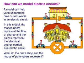 The document discusses key concepts in electric circuits including potential difference, current, resistance, and Ohm's law. It uses analogies like water flowing in pipes and moped riders delivering pizzas to explain potential difference and current. It defines technical terms such as coulomb, voltage, electromotive force, resistivity, and conventional versus electron flow. Factors that determine resistance like length, cross-sectional area, and material are explored. Simulations are presented to illustrate these concepts in a visual, interactive way.